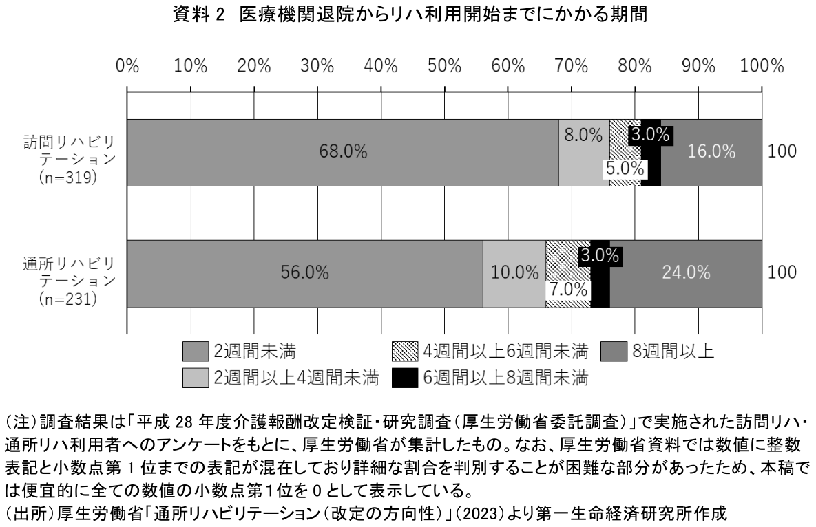 厚生労働省は2016年度に、訪問リハ・通所リハ利用者が医療機関を退院してからリハを開始するまでにかかる期間に関する調査を実施している(資料2)。訪問リハでは、かかる期間を2週間未満と回答した割合が約68%で、2週間以上の期間を要した割合は約32%であった。また、通所リハでは、かかる期間を2週間未満と回答した割合が約56%で、2週間以上の期間を要した割合は約34%であった。一般的に退院後の適切なリハ提供が身体機能の維持などには重要とされているが(注10)、この結果からは、2016年度の時点において早期のリハ提供が必ずしもすべての利用者に行き届いている状況とまではいえないだろう。