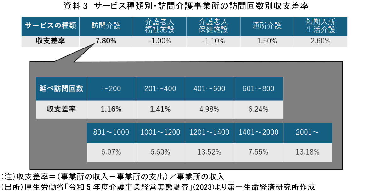 直近2024年度の介護報酬改定では、訪問介護の基本報酬は引き下げられている。介護報酬が全体で1.59%のプラス改定だった一方で、訪問介護の基本報酬は身体介護・生活援助・通院等乗降介助いずれも2%以上の引き下げとなった(注13)。梅原(2025)は「厚生労働省は引き下げの理由について、訪問介護事業所の利益率が高いことを挙げる」と指摘しており、訪問介護事業所が利益の出やすい事業形態だと判断されたことが基本報酬マイナス改定の一因とされている(注14)。確かに、厚生労働省「介護事業経営実態調査」によると2023年度の訪問介護事業所の収支差率は他の介護サービスと比べて高い(資料3上図)。しかしながら、訪問介護事業所の収支差率を延べ訪問回数別にみると、延べ訪問回数400回以下の小規模事業所では収支差率が1%台であり、決して高いとまではいえないと分かる(資料3下図)。小規模訪問介護事業所の収支差率を踏まえれば、小規模事業所が必ずしも利益の出やすい事業形態とまではいえないことが示唆される。