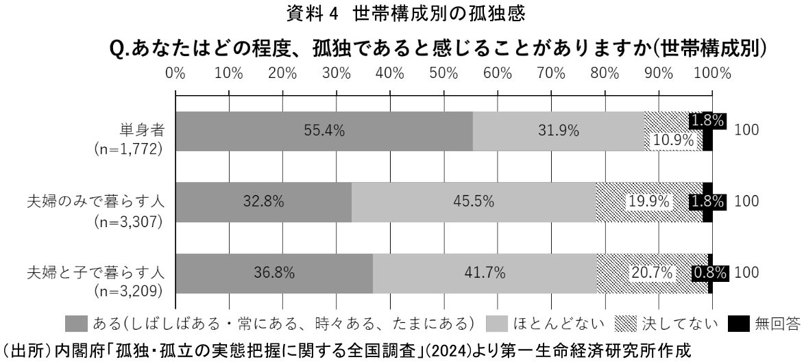 内閣府は2024年度に実施した「孤独・孤立の実態把握に関する全国調査」で、世帯構成別の孤独感について調査している(資料4)。孤独感が「ある(しばしばある・常にある、時々ある、たまにある)」と回答した人の割合は、夫婦のみで暮らす人が32.8%、夫婦と子供で暮らす人が36.8%であったのに対して、単身者は55.4%と半数を上回る結果であった。同居人が居る人と比べて、同居人の居ない単身者の方が、孤独を感じやすい状況におかれていることが示唆されるだろう。