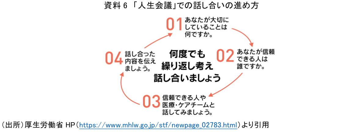 厚生労働省は、かねてより人生の最期をめぐる施策について、時代にあわせて取り組んできた。人生の最終段階における治療の開始・不開始や中止といった医療のあり方などの問題については、1987年以来検討会を重ねている(柏﨑,2021)。2007年には「終末期医療の決定プロセスのあり方に関する検討会」において、人生の最終段階における医療のあり方に関するガイドラインが初めて策定された。2018年の改訂では、「終末期医療」から「人生の最終段階における医療」へ名称が変更され、高齢社会の進行に伴う高齢者向け施設・自宅での療養・看取りの需要増大を背景として、ACP(アドバンス・ケア・プランニング:人生の最終段階の医療・ケアについて本人が家族や医療・ケアチームなどと事前に繰り返し話し合うプロセス)の概念が追加された。厚生労働省はACPを「人生会議」という愛称で呼ぶこととし、「もしも」の時に望みをかなえる第一歩として話し合いの場を設ける重要性について、普及・啓発活動を進めている(資料6)。