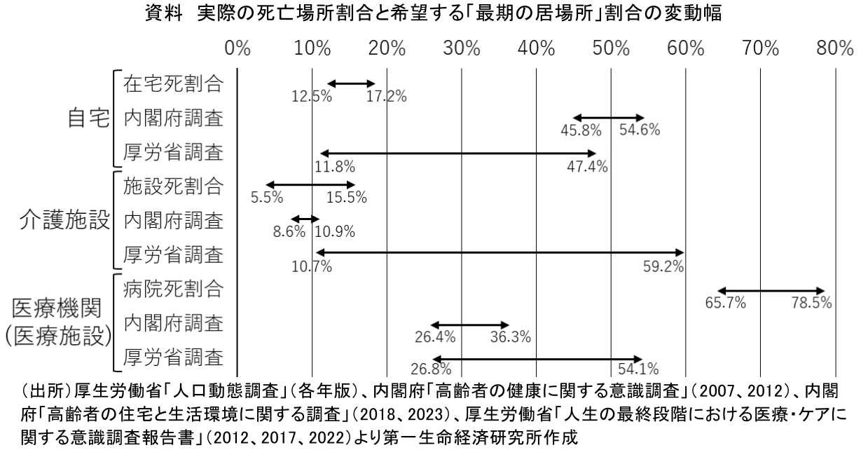 ここでいう「乖離」は単に1時期の調査結果と1時期の死亡場所構成比とを比較して国民意識と実際の死亡場所構成比との間に差異が存在するという意味ではなく、調査の条件等による国民意識の流動的な揺らぎが国民意識と実際の死亡場所構成比との間に完全に合致しない状況を生んでいるという意味であることには留意されたい。