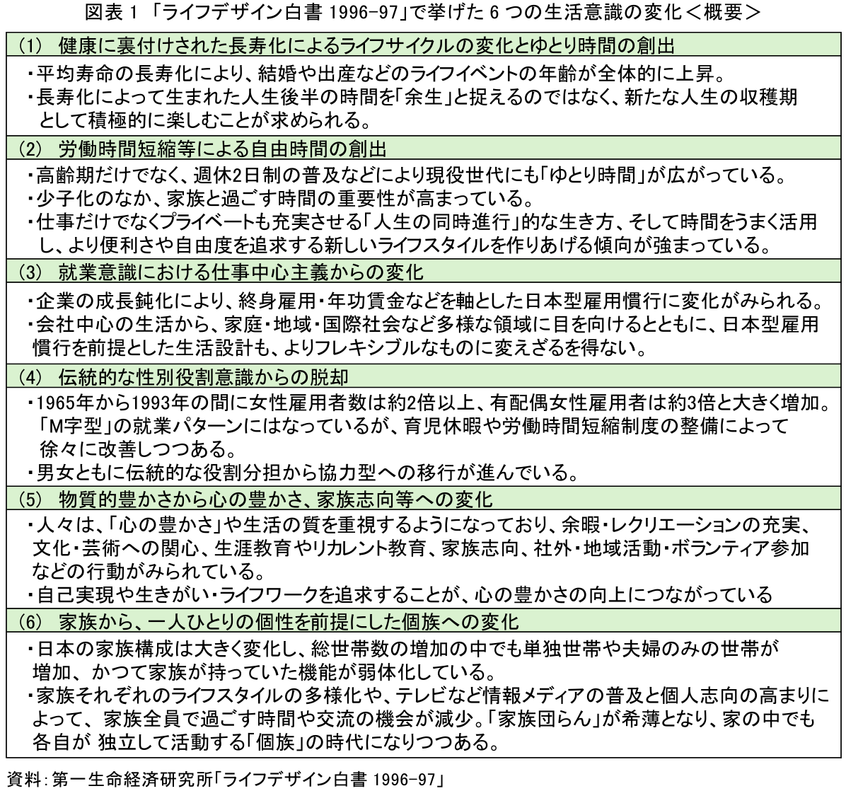 上記の6つの変化「(1) 健康に裏付けされた長寿化によるライフサイクルの変化とゆとり時間の創出」「(2) 労働時間短縮等による自由時間の創出」「(3) 就業意識における仕事中心主義からの変化」「(4) 伝統的な性別役割意識からの脱却」「(5) 物質的豊かさから心の豊かさ、家族志向等への変化」「(6) 家族から、一人ひとりの個性を前提にした個族への変化」は、いずれも現代と強く関連しているものである。