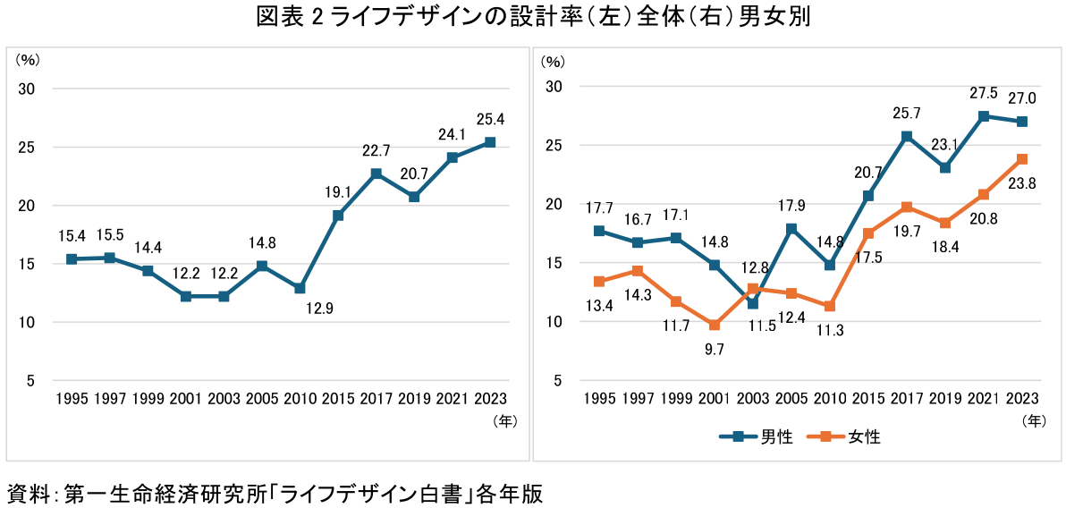 図表2は、ライフデザインについて「ほとんど設計ができている」「ある程度設計ができている」と回答した人の合計割合(以下「設計率」)である。全体では、調査開始時の1995年は15.4%であり、2010年まで大きな変化はみられなかった。しかし、2015年に19.1%に上昇し、以降増加傾向に転じた。直近の2023年には25.4%となり、約4人に1人が設計済となっている。男女別にみると、男性の方が女性より設計率が高い傾向が、調査開始時より続いているが、1995年から2023年にかけて男性は約1.5倍、女性は約1.8倍に増加しており、女性の方が増加の度合いが大きい。