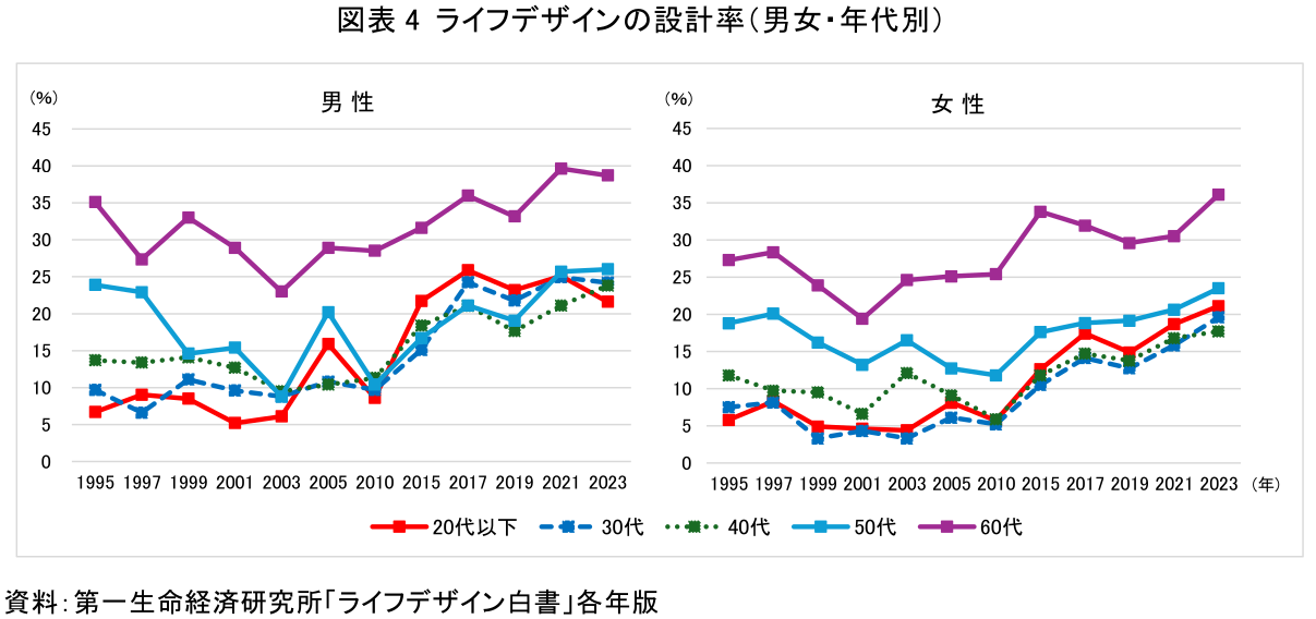 ライフデザインの設計状況について、さらに詳しく確認していく。図表4は、男女・年代別にみた設計率である。男女ともに、増加が著しいのは20代以下、次いで30代である。50代・60代は、2000年代中盤頃より、それまでの低下傾向から上昇に転じたが、その伸びは限定的であった。特に男性では、1995年と2023年の設計率はほぼ同水準である。最も増加したのは女性の20代以下であり、1995年の5.8%から2023年は21.1%と約3.6倍になった。男性の20代以下も、1995年の6.7%から2023年は21.6%と、約3.2倍になっている。図表2で全体の設計状況の推移を示したが、その増加に寄与したのは主に若年層であったようだ。