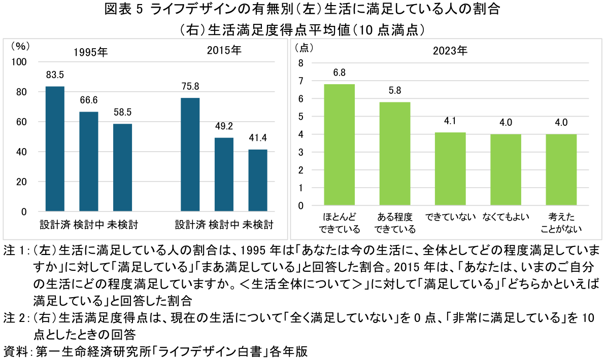 「人々の個性的かつ創造的な生き方の提案」というライフデザインの意義は今も変わらない。むしろライフコースが多様化した今こそ、この考えがより重要になっている。このようなライフデザインは、これまでも生活満足度を高めてきた。図表5はライフデザインの有無別にみた生活満足度である。調査を開始した1995年、設計率が上昇した2015年、そして直近2023年と一貫して、ライフデザインをしている人ほど生活満足度が高い。