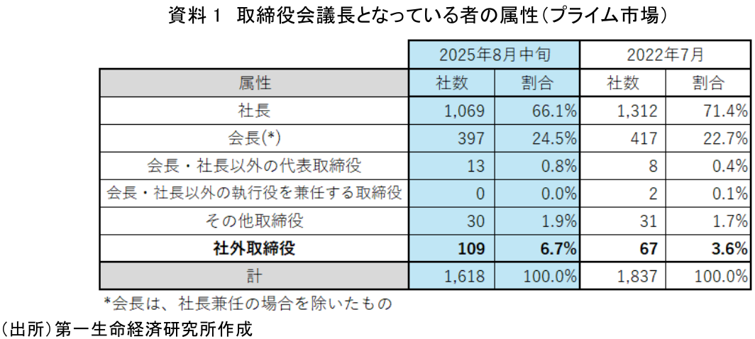 資料1は、プライム市場で2025年8月と2022年7月の取締役会議長となっている者の属性を比べたものである。2025年8月時点で社外取締役を取締役会議長に選任する企業は109社(6.7%)となり、3年間で約1.8倍に増加した(注1)。依然として少数派だが増加傾向は着実である。