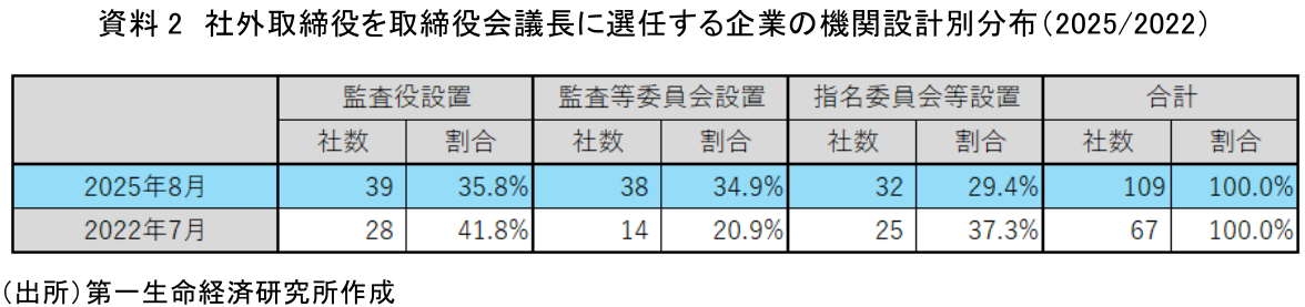 資料2は社外取締役を取締役会議長に選任している企業を、企業の機関設計別に集計したものだ。2022年の調査結果も併せて示した。