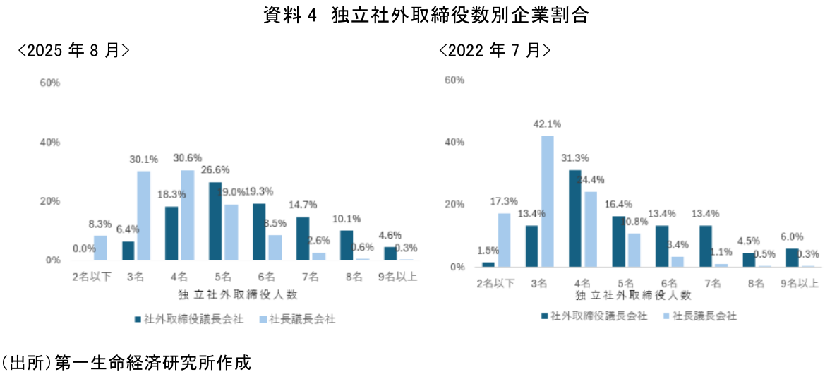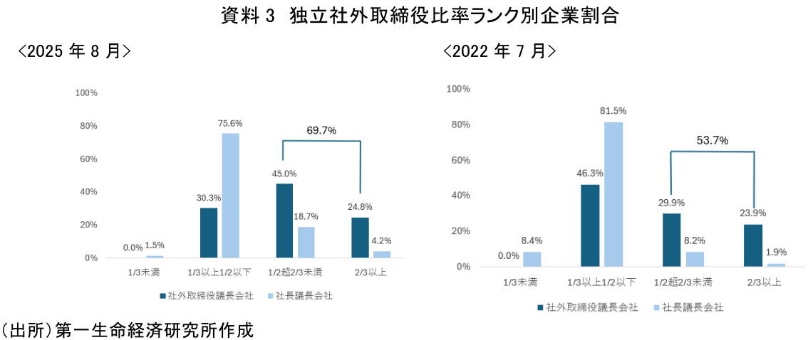 資料3から、2025年では社外取締役を議長とする企業の69.7%が独立社外取締役比率2分の1超を確保している(2022年では53.7%)。一方、社長が議長を務める企業では独立社外取締役比率3分の1以上、2分の1以下の層が75.6%と最多となっており、独立社外取締役比率の面で、両者の差は依然として大きい。