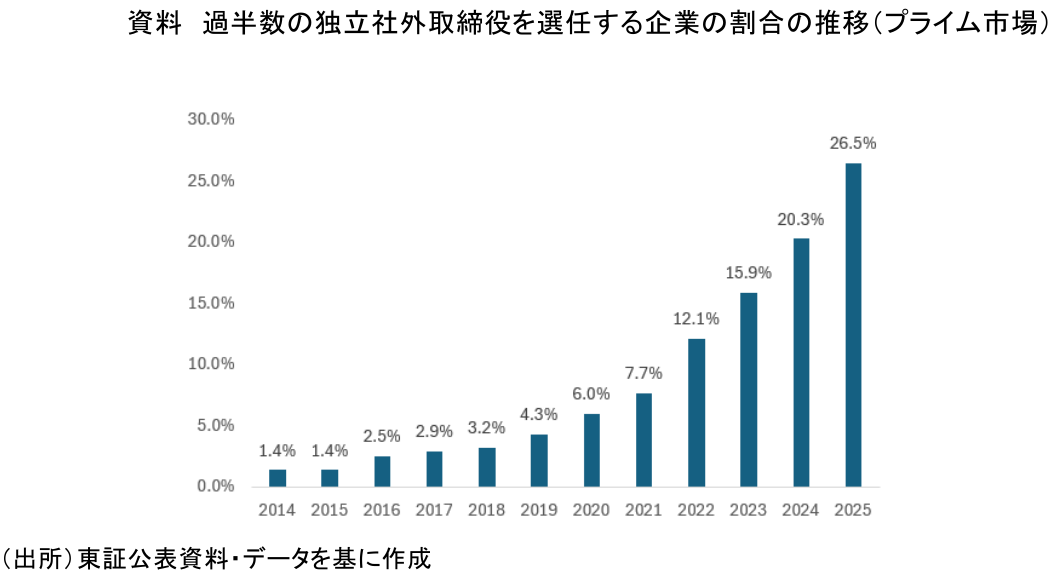 2022年から2025年の実績からは、緩やかではあるが着実な増加傾向が確認でき、今後5年以内に10%を突破するシナリオも現実味を帯びてきたといえる。企業は監督機能強化の手段として、社外取締役を取締役会議長に選任することを検討する時期に差し掛かっているのではないだろうか。
