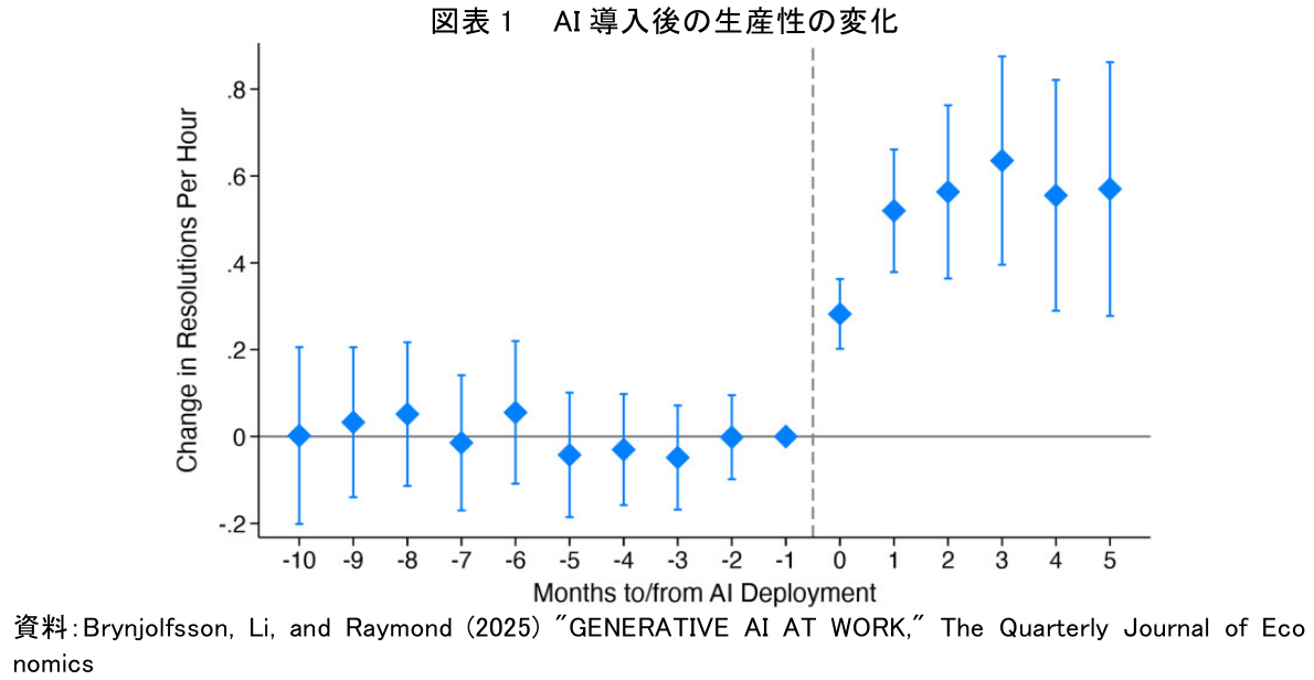 まず、AIは生産性を即座に大幅に向上させるということが示された。図1は、AIアシスタントを導入した時点(横軸のゼロ地点)を境に、社員一人ひとりの生産性がどのように変化したかを時系列で示したものである。縦軸の「Change in Resolutions Per Hour」は、「1時間あたりに解決できた仕事の数が以前より何件増えたか」を意味する。グラフを見れば一目瞭然で、AI導入直後から増加が確認され、観測された5か月のあいだ概ね上昇基調を保っている。