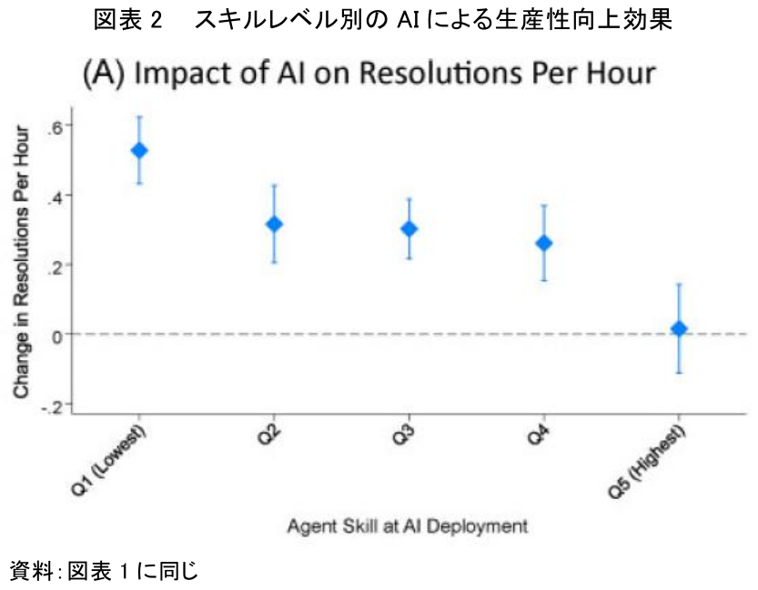 この結果は、AIツールが特に経験の浅い、スキルレベルの低い社員にとって特に強力な支援ツールとして機能する一方で、既に高いスキルをもつ社員にとってはその効果が限定的であることを示唆している。