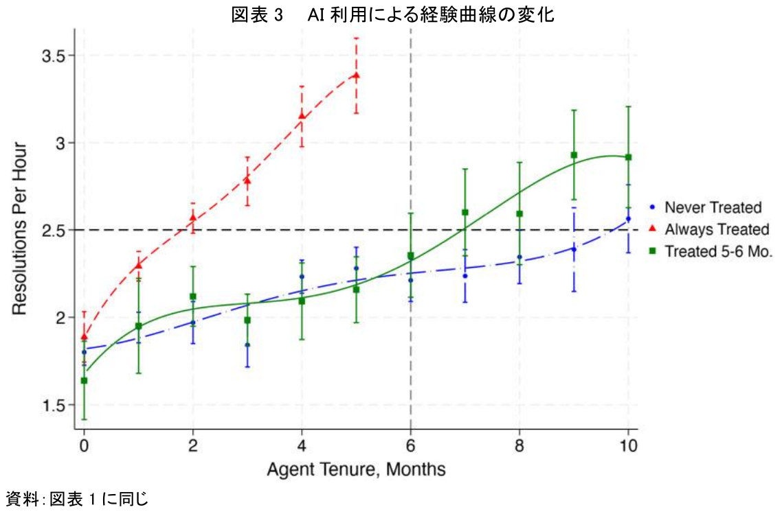 前の項目で見た傾向は、新人の成長スピードを比較した図3でさらにはっきりする。この図では、AIを使わない新人(青い線)が生産性レベル2.5(縦軸)に達するのに約10カ月かかっている。これに対し、入社直後からAIを使う新人(赤い線)は、約2カ月で同じレベルに到達している。また興味深いのは、入社後、最初の4ヶ月間はAIを利用せずに働き、入社5ヶ月目になって初めてAIへのアクセスを得て利用を開始した従業員(緑の線)が示す生産性レベルの推移である。このグループは、AI導入前の約5ヶ月間は青い線とほぼ同じペースで成長していたが、AI利用開始後は明らかに成長が加速している。AIが新人の成長を劇的に早めることが、このグラフからはっきりと読み取れる。