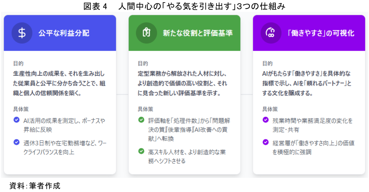 この「生産性向上の罠」を回避し、AIの恩恵を組織と個人の両方にとって最大化するためには、技術の導入と同時に、人間中心のやる気を出させる仕組み作りが不可欠である。