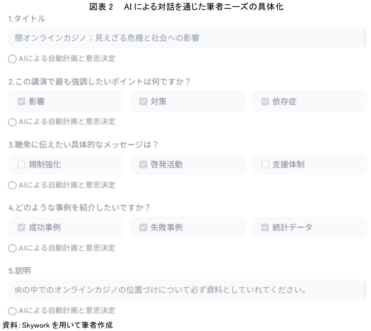 今回の実験では、これらの原則に従って対話を進めた結果、AIが実際の顧客の意図を汲み取ることができた。元レポートで扱った「社会への影響」「対策の必要性」「ギャンブル依存症問題」という主要テーマを踏まえ、講演で強調したいポイントとして「影響」「対策」「依存症」を選択し、特に聴衆に伝えたいメッセージとして、AIが提示した複数の選択肢の中から「啓発活動」にチェックを入れた(図表2のチェックボックス形式の質問項目参照)。これは、顧客が社会的な問題意識を強く持ち、単なる現状報告ではなく、具体的な対策と啓発の重要性を訴えたいと考えていたためである。さらに、チェックボックスだけでは伝えきれない具体的な要望として、説明欄に「IRの中でのオンラインカジノの位置づけについて必ず資料として入れてください」と文章で補足した。これにより、最終的なアウトプットを筆者が作成したいイメージに近づけることができた。