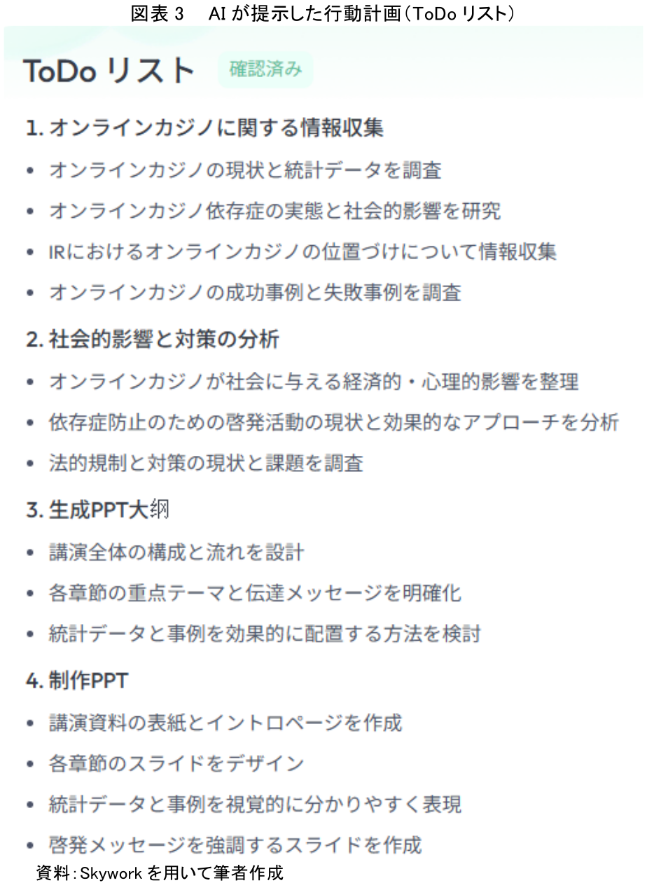 筆者からの詳細な指示を受け、AIは次に、資料作成の全工程をタスクに分解した「ToDoリスト」を提示してきた。これは、AIが筆者の意図を正しく理解したかを確認するための「中間報告」としての役割を果たす。図表3が示すように、リストは大きく分けて「1. オンラインカジノに関する情報収集」「2. 社会的影響と対策の分析」「3. 生成PPT大綱」「4. 制作PPT」の4段階で構成されている。これは、人間がプロジェクトを進める際の思考プロセス、すなわち情報収集→分析→構成案作成→実制作という流れを忠実に再現している。