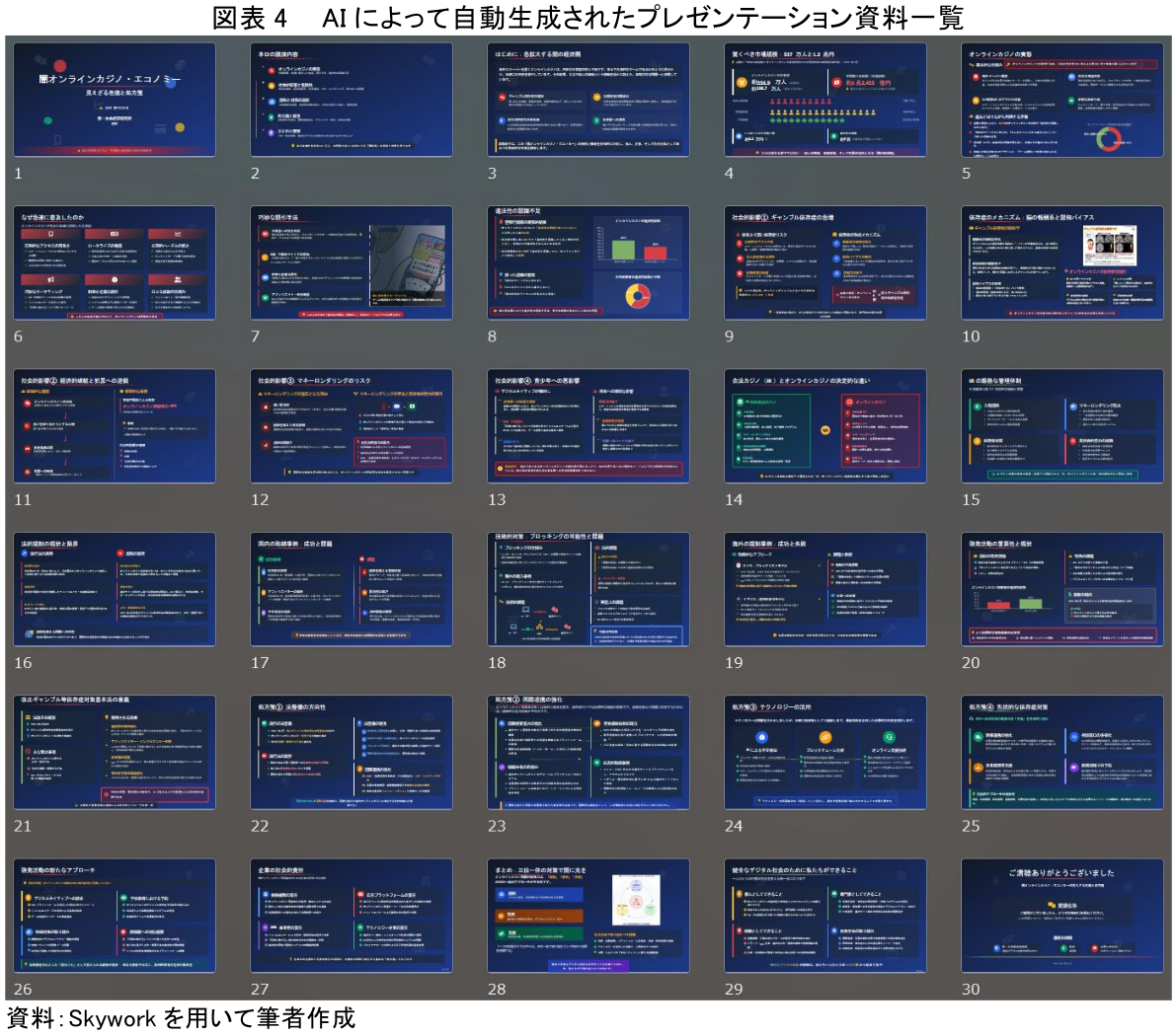 ToDoリストを承認すると、AIは計画に沿って自動的に資料作成プロセスを実行し、最終的に30枚のスライドからなるプレゼンテーション資料を生成した。以下が、生成されたスライドの一覧である。図の通り、単にテキストを並べただけでなく、タイトルページ、目次、各章のスライド、そして結論と、講演の流れに沿った一貫性のある構成となっている。また、グラフや図解も適切に配置されており、視覚的な分かりやすさも考慮されていることが分かる。