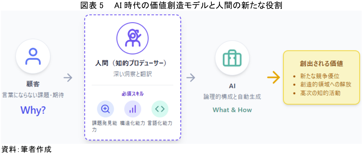 今回の実験で言えば、AIへのインプットは単なる「指示」ではなく、顧客の課題を構造化し、解決への道筋を描く「設計図」そのものであった。AIからの質問に答えるプロセスは、我々自身の思考を整理し、顧客への理解を深めるための「対話」でもあったのだ。これからのビジネスパーソンに求められるのは、スライド作成の技術(オペレーションスキル)ではない。顧客の課題の本質を見抜く「課題発見能力」、複雑な事象を整理し要点を抽出する「構造化能力」、そしてそれをAIが誤解なく理解できる言葉に落とし込む「言語化能力」なのである。
