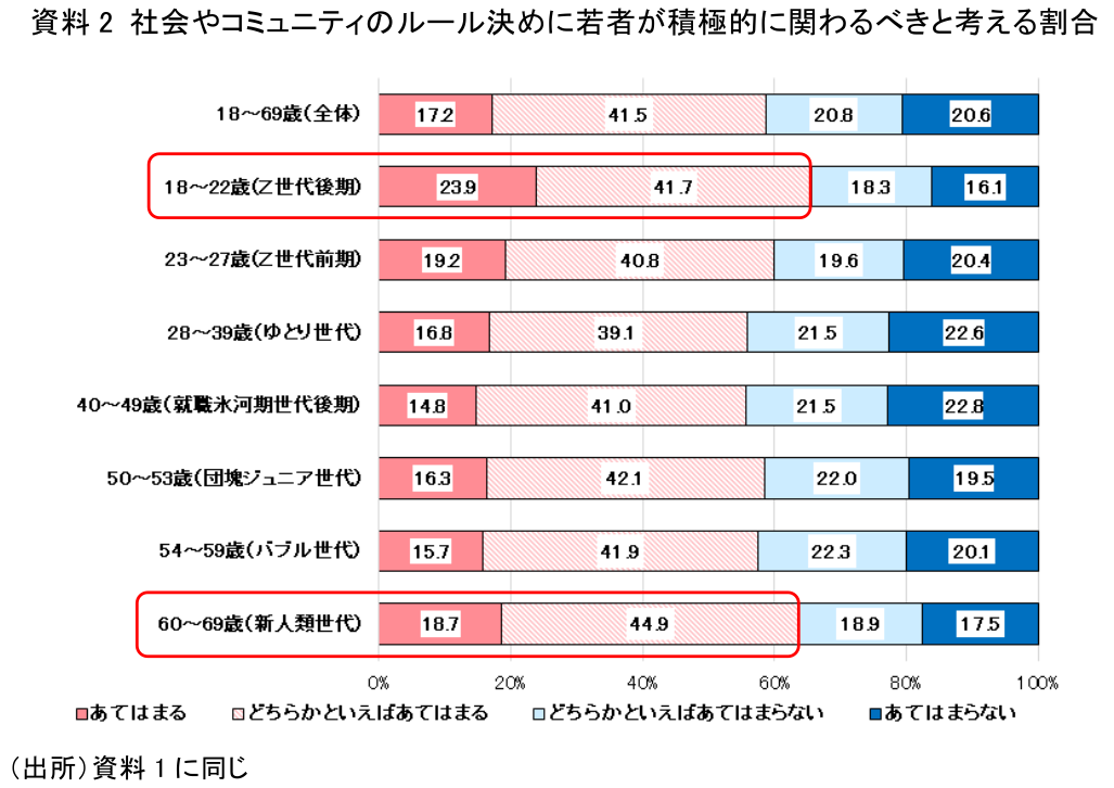 前述のように、現在の日本では若い世代の政治への関心は高まりつつあるが、それに関連して、若者が社会の意思決定に参画する機運も醸成されている。第一生命経済研究所における同調査によると、「社会やコミュニティのルール決めに若者が積極的に関わる方がよいと思う」について、「あてはまる」「どちらかといえばあてはまる」の割合の合計は、全体で58.7%と過半数に上った(資料2)。本調査で最も若いZ世代後期(18~22歳)では65.6%と、他世代に比べても最多だが、加えて注目すべきは、本調査で最も高齢にあたる新人類世代(60~69歳)でも63.6%に達している点だ。つまり、若者が社会の意思決定に関わり、その声を反映させることを、当事者である若い世代だけではなく高齢世代も肯定的に捉えているということである。