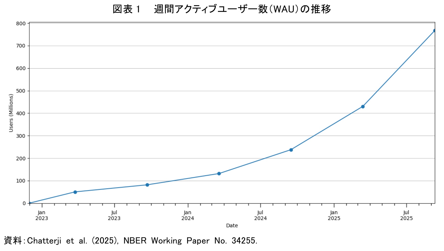 本論文によると、まず、利用者数が驚異的なペースで増加している点が傾向として挙げられる。2025年7月時点で週間アクティブユーザー数(WAU)は7億人を超え、世界の成人人口の約10%に達している。2022年11月のサービス開始からわずか2年半余りで、一部の先進的な層だけでなく、広く一般に浸透したことを示す数字である。