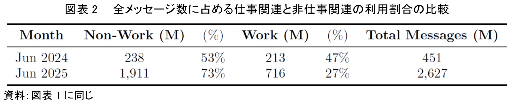 図表2は、全メッセージ数に占める仕事関連と仕事関連でない利用割合を2024年6月と2025年6月で比較したものである。2024年6月時点では仕事関連でない利用が53%であったが、わずか1年後の2025年6月にはその割合が73%にまで急増し、利用の重心が大きく変化したことが示されている。
