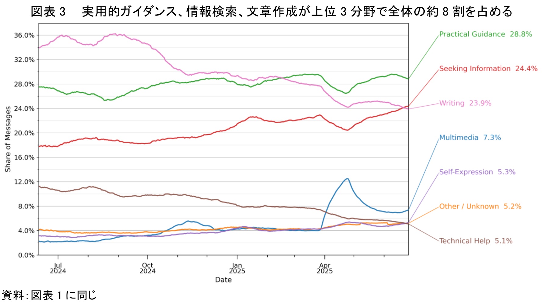 さらに、仕事用途でないAIの利用目的は多岐にわたるが、その大半は日常生活における課題解決や情報収集に関連する3つのカテゴリーに集約されている。専門的な用途よりも、より普遍的で実用的なニーズに応える形で利用が拡大していることがわかる。図表3は、2025年6月時点でのAIとの「会話」の目的別シェアを示したものである。「実用的なガイダンス」が28.8%、「情報検索」が24.4%、「文章作成・編集」が23.9%を占め、これら上位3分野で全体の77.1%に達している。