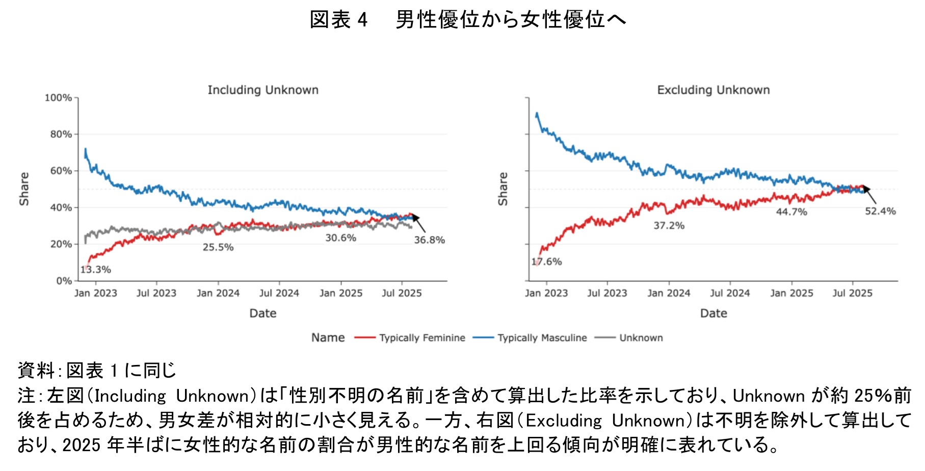 最後に、ユーザー層もまた当初の想定から大きく変化している。サービス開始当初に指摘された性別による偏りは解消された。図表4右は、利用者の名前から性別を推定した比率の推移を示したものである。サービス開始当初は男性と推定されるユーザーが約80%を占めていたが、その差は徐々に縮小した。2025年初頭に男女比が逆転し、2025年6月には女性と推定されるユーザーの比率(52.4%)が男性を上回った。