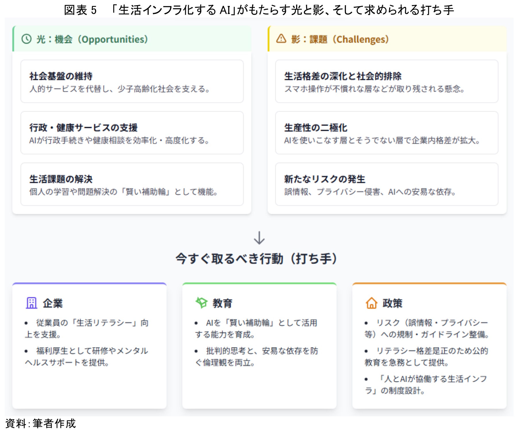 政策においては、誤情報の拡散や個人情報漏洩、依存といったリスクへの規制やガイドラインの整備に加え、AIを誰もが安全に利用できる社会インフラとして位置づけるための制度設計が求められる。特に、AIリテラシー格差を是正するための公的教育プログラムの提供は、喫緊の課題といえるだろう。