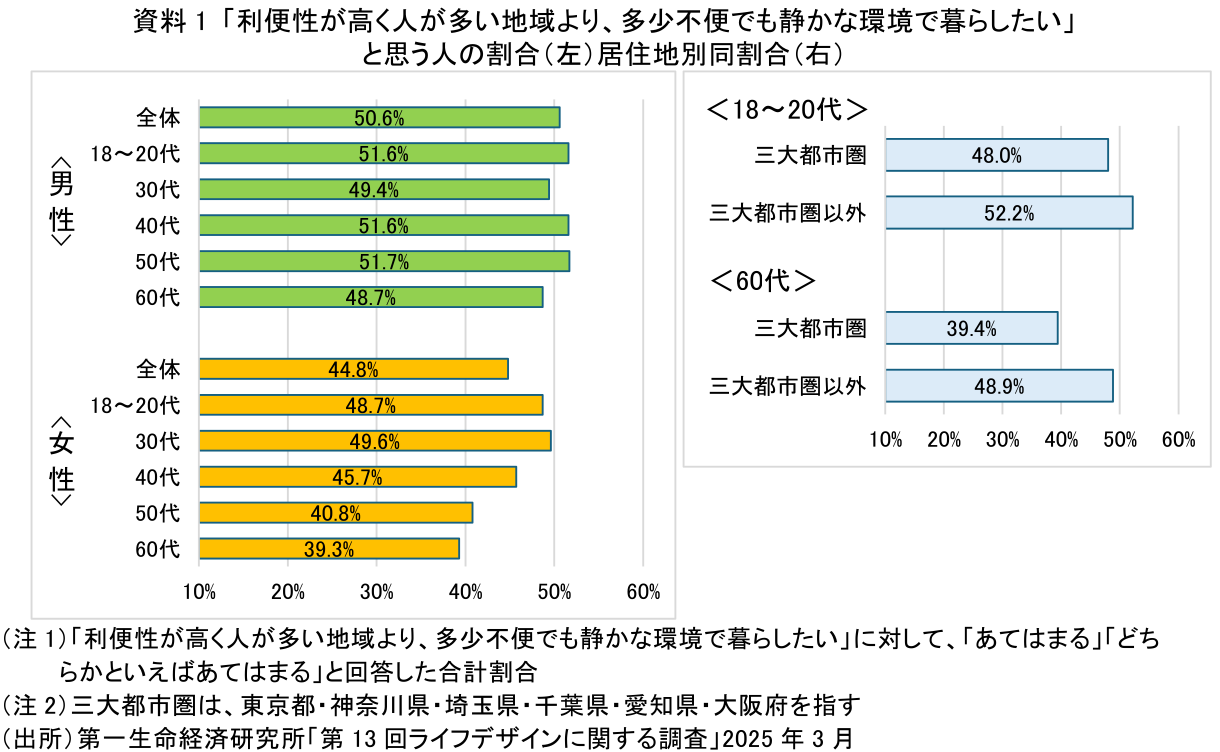 一方、当研究所の調査では「利便性が高く人が多い地域より、多少不便でも静かな環境で暮らしたい」と思う人は少なくない。資料1のとおり、男性では50.6%、女性は44.8%が「あてはまる」に該当した。若い年代や三大都市圏に居住している人でも半数程度にのぼる。