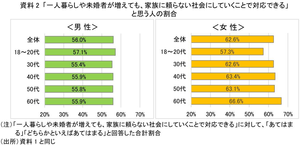少子高齢化、未婚化の進行という社会構造の変化により、単身高齢者世帯、特に女性の単身高齢者世帯が増加することが予想される(星野,2025)。単身高齢者の貧困リスクや、孤独感・孤立感による心身の健康リスクが懸念されるが、「一人暮らしや未婚者が増えても、家族に頼らない社会にしていくことで対応できる」と考える人は男性より女性の方が多い(資料2)。男性は年齢による違いはほとんどみられないが、女性は年齢が高まるにつれて増え、60代女性では66.6%と最も多い。