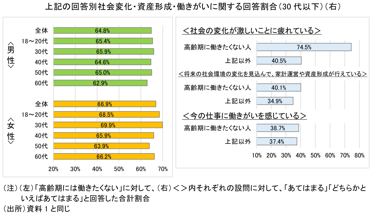 また、働き盛りの30代以下について、高齢期に働きたいか否かと他の設問の関係をみた結果が資料3右である。「将来の社会環境の変化を見込んで、家計運営や資産形成が行えている」「今の仕事に働きがいを感じている」といった設問よりも、「社会の変化が激しいことに疲れている」か否かに、顕著な違いがみられた。高齢期に働きたくないと回答した人ほど、社会の急速な変化に疲労を感じている傾向がある。
