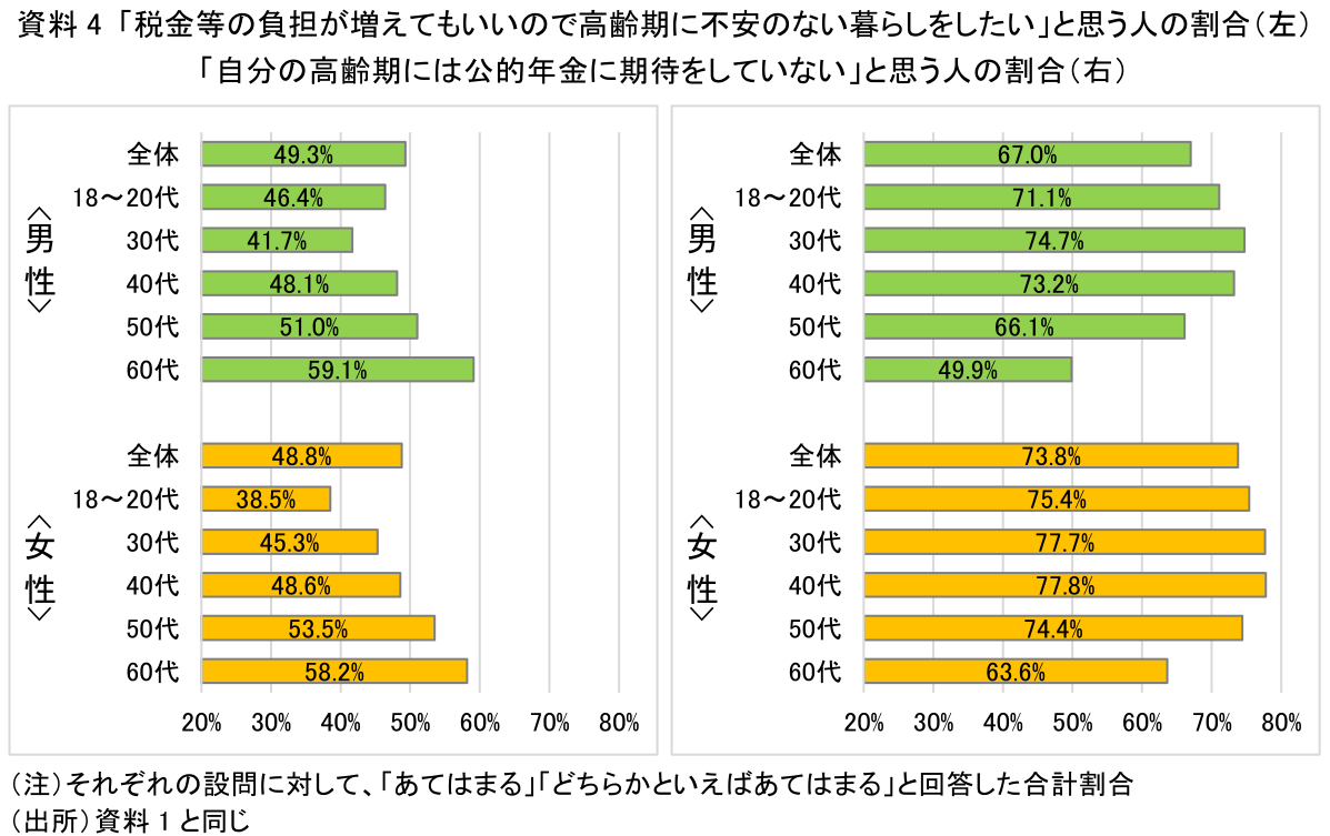 人材確保に向けた処遇改善には、国民負担の増加も一案となるが、「税金等の負担が増えてもいいので、高齢期に不安のない暮らしをしたい」と思う人は、若い世代ほど低く、半数に満たない(資料4左)。この意識の差は、政府への信頼感の有無によっても違いがみられ、政府に対して信頼感がある人では約64%、そうは思わない人では約46%が、「税金等の負担が増えてもいいので、高齢期に不安のない暮らしをしたい」と思っている(図表省略、全年代)。