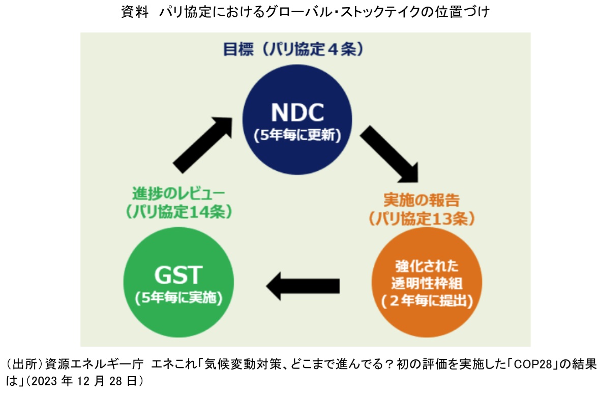 COP30は「グローバル・ストックテイク(GST)」完了後、評価から実施へと重心を移すタイミングのCOPだ。GSTとはパリ協定の目標達成に向けた世界全体の進捗評価で、5年ごとに実施される(資料)。2023年のCOP28で第1回GSTの結論がまとめられた。そこでは2030年までに「再生可能エネルギー容量を世界全体で3倍に」「エネルギー効率改善率を2倍に」といった目標が示された。ブラジルはGSTの成果を「1.5℃目標の羅針盤」と位置づけ、その実現を後押しする行動アジェンダを提示する考えだ。COP30は、これまでの評価を踏まえて各国が約束をどこまで実行に移し、加速できるかが問われる舞台ともいえる。