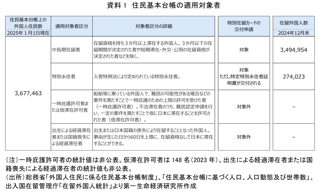 特定在留カードとは、マイナンバーカードとしての機能が付加された在留カード(注1)である。特定在留カードの交付申請資格を有するのは、住民基本台帳に記録されている中長期在留者(注2、注3)、または特別永住者と規定されている。ここで住民基本台帳制度が適用される対象者についてもう少し詳しく見てみる(資料1)。中長期在留者や特別永住者のほかにも一時庇護許可者など、住民基本台帳制度が適用される対象者がおり、2025年1月1日時点でその総数は368万人である。これに対して、今回の特定在留カードの交付申請資格があるのは前述のとおり中長期在留者および特別永住者であり、2024年12月末時点ではそれぞれ349万人、27万人、合わせて377万人となっている。2026年6月までに、いつから交付申請が可能なのか政令で公表される予定だが、現時点では未定である。したがって、現時点での在留外国人の増加状況に鑑みれば、交付申請可能となった時点でその申請資格を持つ外国人は、377万人と同等かそれ以上になると考えられる(注4)。