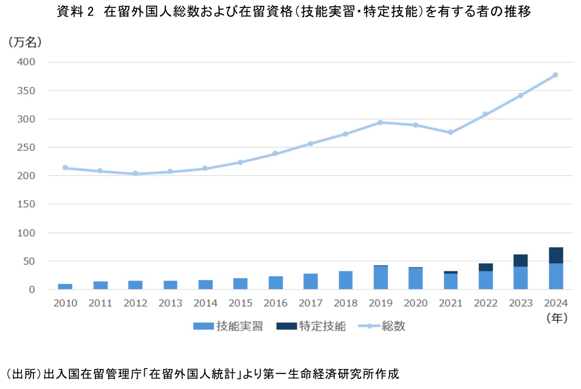 ここで、特定技能制度創設時に見込んだ在留外国人の増加について、実際の状況について見てみる。資料2は、特定技能制度と、その後制度的に接続することとなる技能実習制度(注6)が創設された2010年以降の在留外国人数、および在留資格のうち技能実習と特定技能を持つ外国人数の推移を示したものである。特定技能制度が開始された2019年以降、コロナ禍で技能実習の人数が一時的に減少したものの(2020年および2021年)、それ以降は特定技能と技能実習とを合計した人数は増加している。2024年12月末時点では74.1万人、また在留外国人総数に占める割合は19.7%と、最も多い永住者(91.8万人、24.4%)に次ぐ規模になっている。