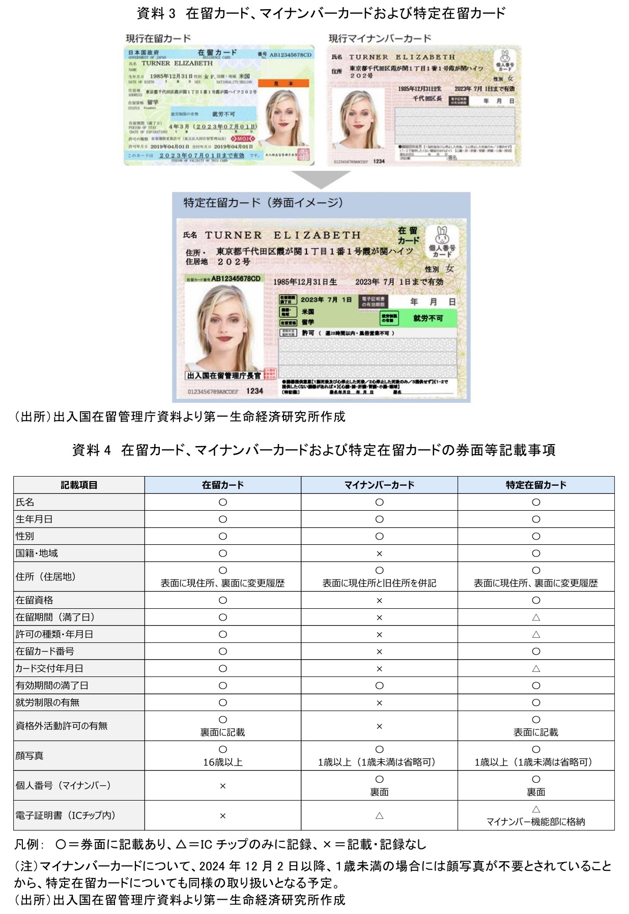 資料3は、現行の在留カード、マイナンバーカードおよび特定在留カードの券面イメージを示したものである。また、資料4は各カードの券面等記載事項を比較したものである。
