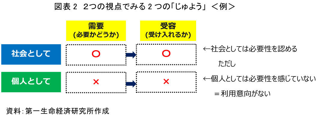 実際、全国各地での自動運転実証の際は、住民へのアンケート調査などで必要性の有無(需要)が問われるケースが多い。ただし、「需要」と「受容」には社会的観点と個人的観点の2つの側面があることを分けて捉える必要がある(図表2)。