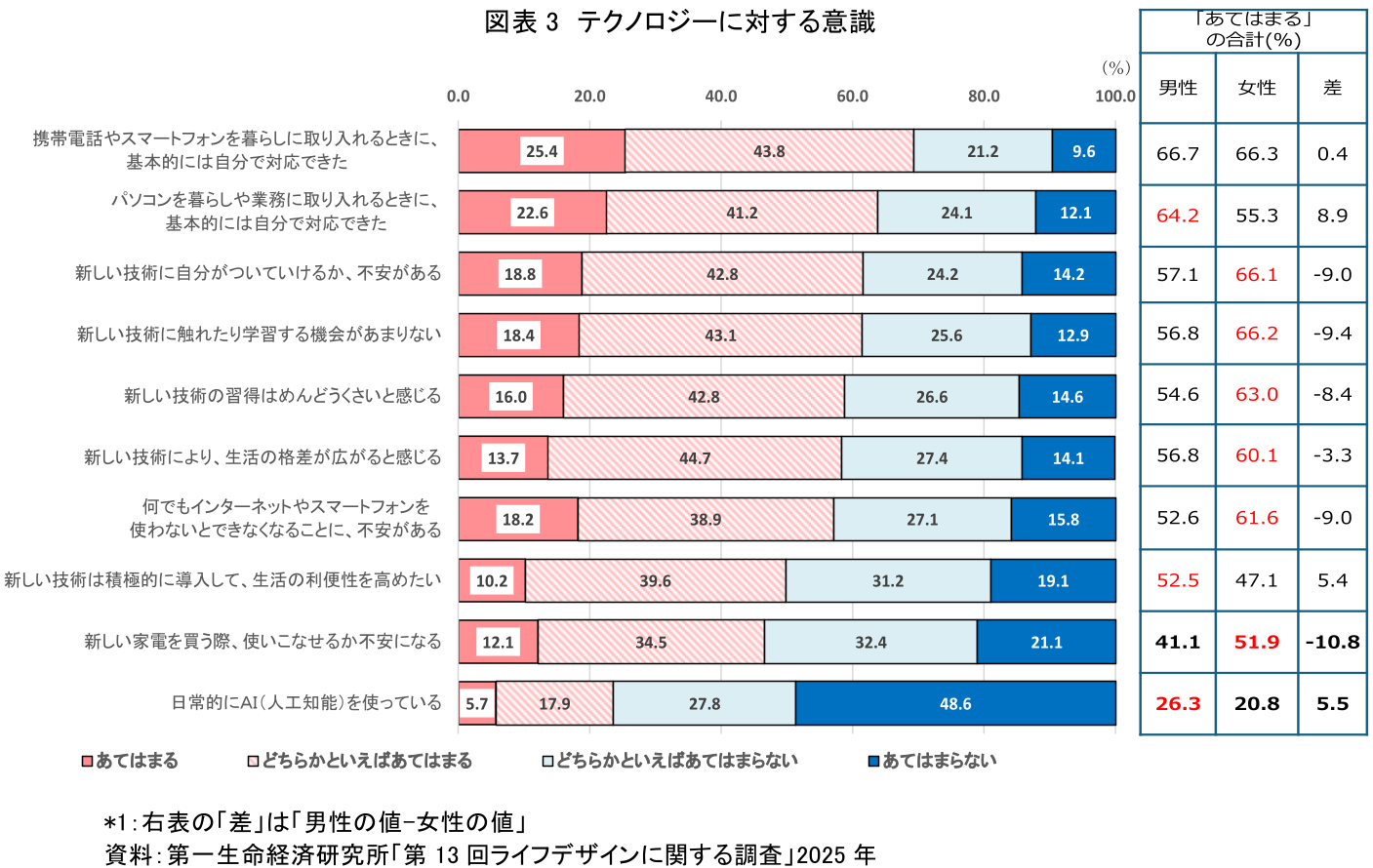 第一生命経済研究所が実施した第13回ライフデザイン調査では、テクノロジーについて興味深い結果が得られている。一般に女性は男性に比べてテクノロジーに苦手意識や不安感があり、テクノロジーへの接触機会についても少ないなど、全体的に否定的で受容度が低いとの認識がある。実際に女性では「パソコンを暮らしや業務に取り入れるときに、基本的に自分で対応できた」「新しい技術は積極的に導入して、生活の利便性を高めたい」などの割合が男性より低く、不安感も高いなどの傾向が確認された(図表3)。