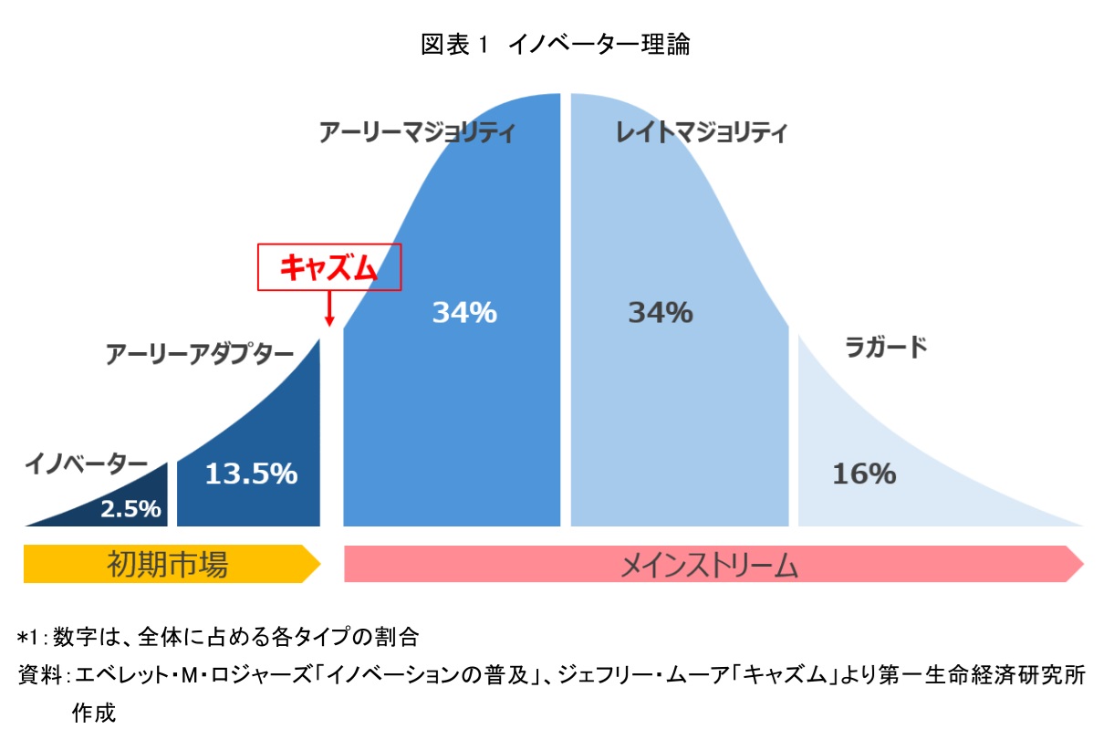 新しい技術や製品の普及に関して、そのプロセスを示す「イノベーター理論」がある(図表1)。消費者を導入時期によって5つのタイプに分け、早い順に、イノベーター(革新者)、アーリーアダプター(初期採用者)、アーリーマジョリティ(前期追従者)、レイトマジョリティ(後期追従者)、ラガード(遅滞者)に区分される。