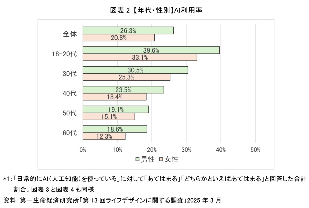 「日常的にAI(人工知能)を使っている」に対して「あてはまる」「どちらかといえばあてはまる」と回答した合計割合(第一生命経済研究所「第13回ライフデザインに関する調査」2025年3月)。本調査はインターネット調査であるため、デジタルリテラシーが比較的高い層が調査対象となっている点に留意が必要。なお、調査時期は2025年3月であり、本稿執筆時点では、さらなる普及が進んでいると予想される。