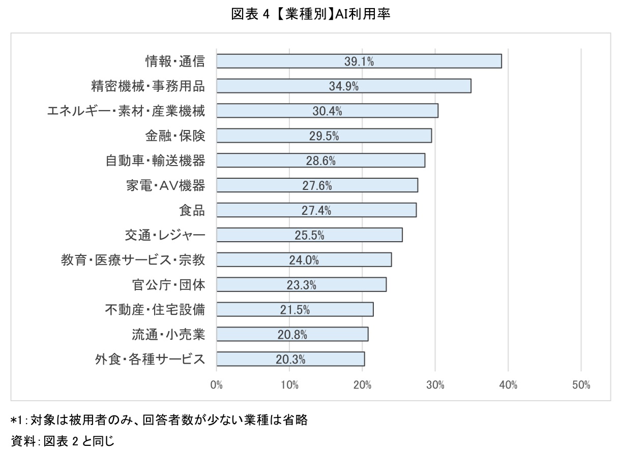 回答者の勤め先の業種別にみても、利用率に違いがみられる(図表4)。最も高いのは情報・通信業(39.1%)であり、最も低い外食・各種サービス業(20.3%)との間にはおよそ2倍の開きがあった。先述のとおり、調査では利用場面は日常生活と仕事とを区別していない。情報・通信業に勤める人は元々テクノロジーへの関心が高く、日常生活でも積極的にAIを利用するケースもあるだろう。しかし、それだけではなく、仕事自体に利用機会の多寡があり、結果として利用率の差が生じている可能性もある。