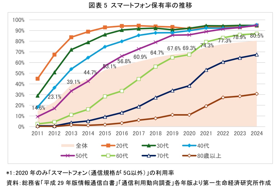 以上のように、市場の拡大局面では、細かな違いはあるものの、AIとスマートフォンの利用者動向には類似した傾向もみられる。スマートフォンが、当初は利用者の属性に偏りがあったものの、その後広く普及した背景には、日常インフラとして定着したことが大きい。宮木(2025) によると、強い需要があれば、テクノロジーの苦手意識や面倒な作業というマイナス側面を凌駕し、行動変容を含めて受容する余地があるということだ。AIについても現状は属性毎に利用率が異なっているものの、その利便性が社会全体で認知されていけば、利用者層の拡大が今後さらに進むことが予想される。