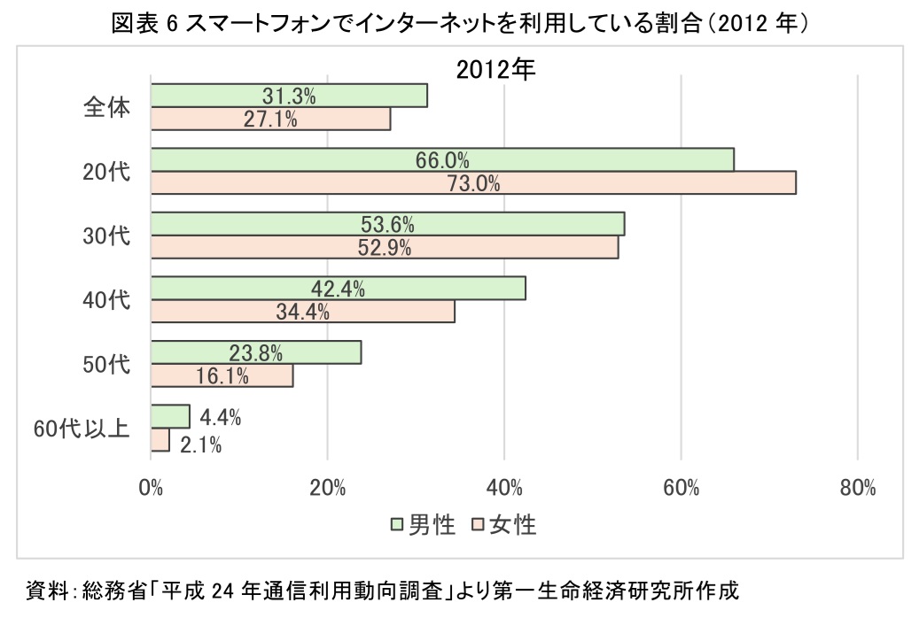 また、スマートフォンが、現在のAIと同じ段階であるメインストリームに移行した2012年時点の「スマートフォンを通じてインターネットを利用する人」の割合をみると、全体では男性の利用率が女性より高いものの、20代では女性が上回っている(図表6)(注3)。柏村(2025) によると、生成AIに関しても、最近の研究では女性の日常利用が拡大していると指摘されている。男性の方がテクノロジーを好むというイメージがあるが、過去のスマートフォンの例からみてもそうとは言い切れない側面があるようだ。