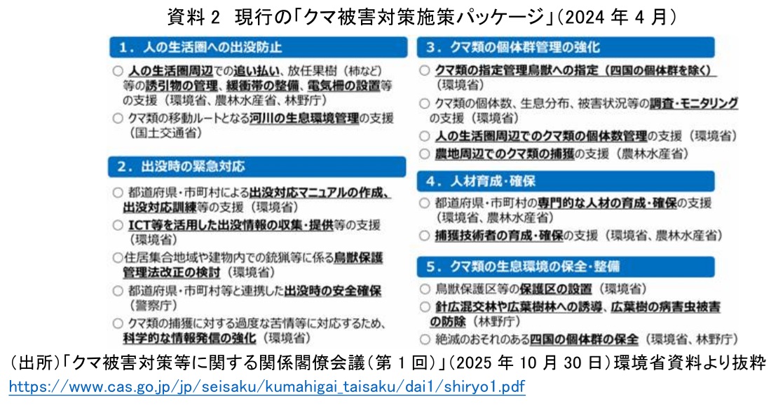 日本には、北海道にヒグマが約1万2千頭、本州と四国にツキノワグマが約4万2千頭(両種を合わせて、以下、クマ)生息している。今年度、どんぐりの凶作等(注1)により、市街地や観光地等、人の生活圏へのクマの出没が相次ぎ、死者数が過去最多の13人(2025年11月5日現在)(注2)、人身被害者数も過去最多を記録した2023年度と同水準となっており、国民の安心・安全確保のための緊急の対策が求められている。この極めて深刻な状況を受け、政府は本年10月30日、これまでの関連省庁の課室長級で構成される「クマ被害対策等に関する関係省庁連絡会議」(以下、連絡会議)を格上げし、内閣官房長官が議長、関連省庁の大臣をメンバーとする「クマ被害対策等に関する関係閣僚会議」(以下、関係閣僚会議)を設置した。従来の環境省、農林水産省、林野庁、国土交通省、警察庁に、今般、文部科学省、防衛省、総務省が新たに加わり、体制が強化された。11月中旬までに「クマ被害対策施策パッケージ(以下、対策施策パッケージ)」を見直すべく取り組みが進められている。