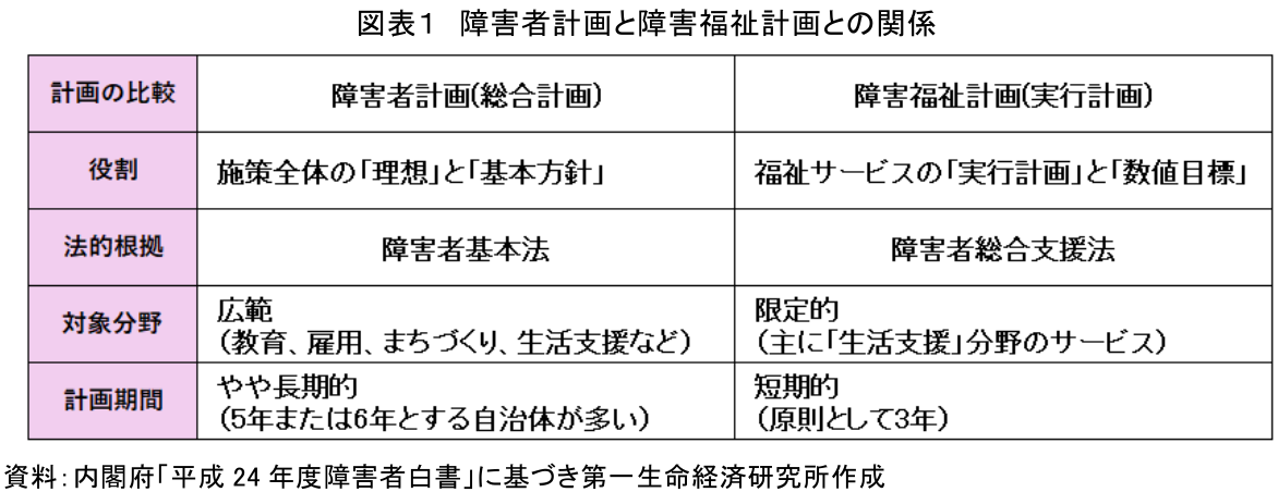 この空洞化は、たとえば障害者計画と障害福祉計画との関係をみても明らかである。障害者計画と障害福祉計画の関係をまとめると図表1のようになる。前者は「大きな総合計画」であり、後者はその「一部を具体化する実行計画」というイメージになる。