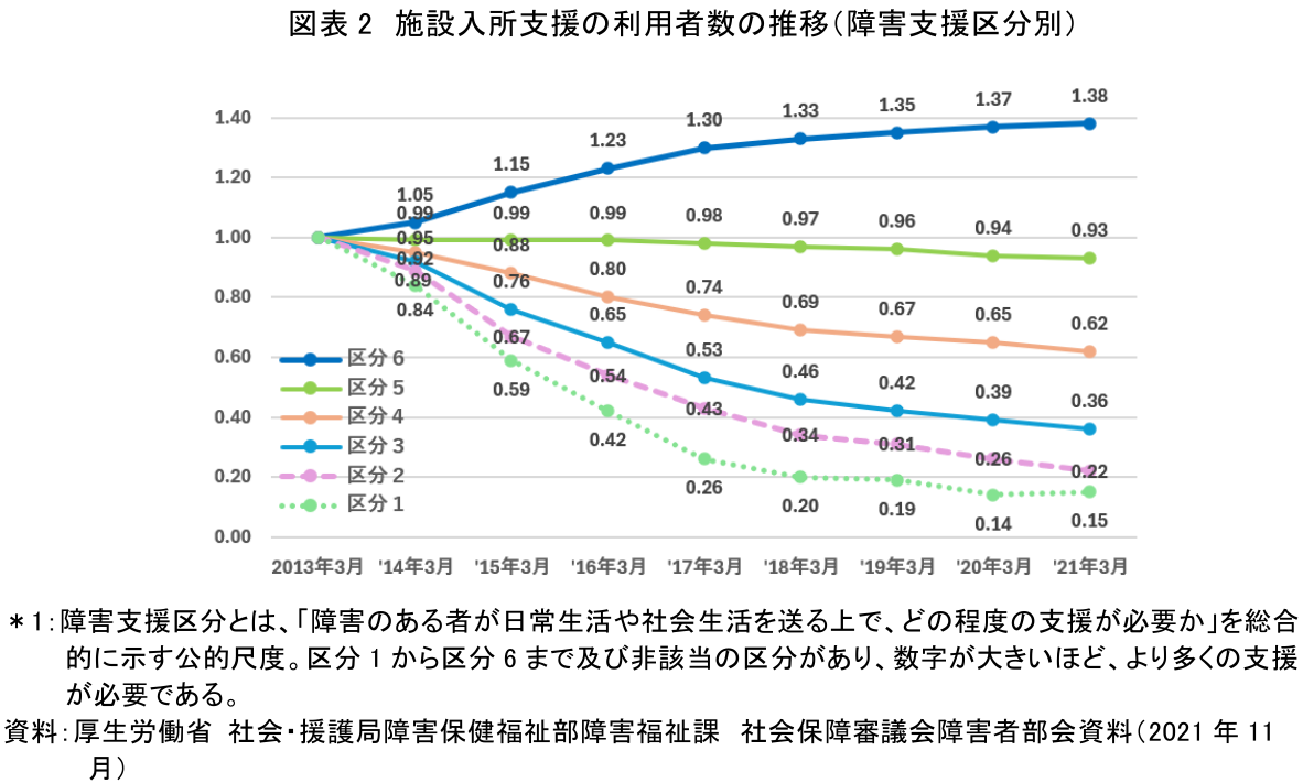 2013年から10年間の施設入所支援の利用者数の推移を障害支援区分別にみると、2013年を1とした場合、支援区分6の利用者は1.38倍に増加しているものの、他の区分の利用者は減少している(図表2)。こうしたことからも、全ての障害者にとってサービスが充実したとは言い切れないといえる。