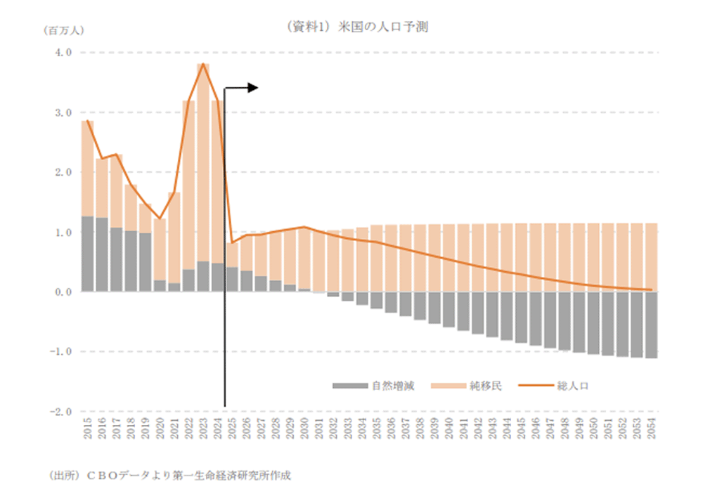 米国では、合計特殊出生率(一人の女性が一生の間で生む子どもの平均数)が22年に1.67と人口の維持に必要な水準である2.1を下回っているものの、人口は自然増(出生者-死者数)と移民の増加によって拡大を続けている。しかし、トランプ政権2期目では、国境警備の強化、亡命申請の制限、一時保護資格の停止、米移民・税関捜査局(ICE)による拘束・強制送還の増加といった対応を取ってきた。これらの政策を受け、CBO(議会予算局)による最新の人口予測(25年9月)は下方修正された。ただ、抜本的な移民制度の変更は不可能との見方から、移民の増加が続き、米国の人口増加を支え続けると予想されている(資料1)。ただし、純移民を除く人口を示す自然増減は2031年に減少に転じ、人口の増加ペースは大幅に鈍化すると推計されている。