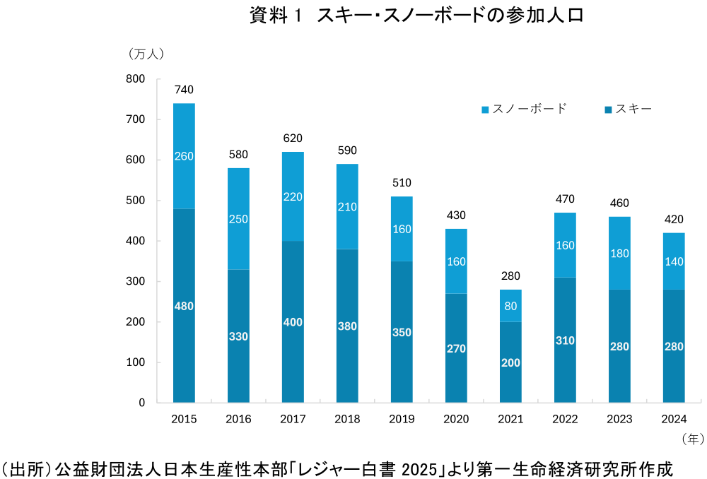 気象庁が2025年9月22日に発表した寒候期予報によると、この冬(12~2月)の気温は全国的にほぼ平年並みで、降雪量は北日本と東日本の日本海側はほぼ平年並み、西日本の日本海側で平年並みか多い、との見通しが示されている(注1)。年々減少してきてはいるが、スキー・スノーボード(以下、スキー)を楽しむ420万人(資料1)にとって、待望の冬が到来する。