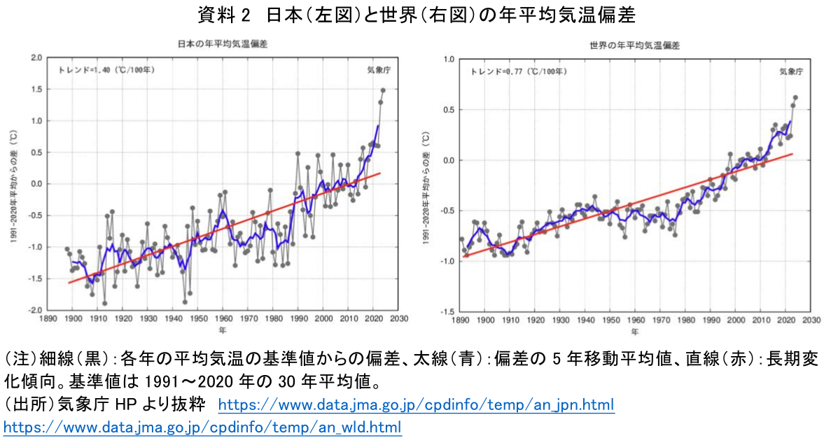一方で、気温の上昇傾向は変わらない。2024年の日本の平均気温の基準値(1991~2020年の30年平均値)からの偏差は+1.48℃で、1898年の統計開始以降、最も高い値となっている(資料2左図)。長期的には100年あたり1.40℃の割合で上昇しており、世界の同0.77℃の上昇(資料2右図)に比べても高い実態にある(注2)。また、国連環境計画(UNEP)が2025年11月に公表した「Emissions Gap Report 2025」によると、今後10年以内に世界の気温は産業革命以前の水準より1.5℃を超えて上昇する可能性が高く、また、各国が現行の政策を続けると今世紀末には2.8℃上昇する。