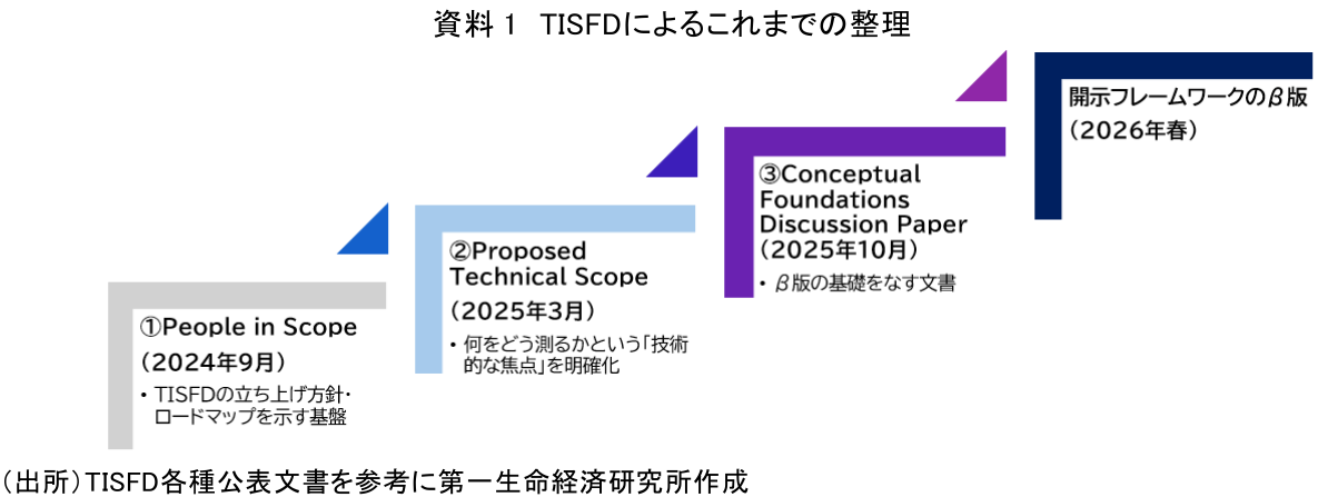 TISFDは、企業等の事業活動による人々への影響と依存と、そこから生じるリスクと機会を体系的に把握・開示するための枠組みを策定する国際的イニシアティブとして、2024年9月に発足した。環境分野ではTCFD(気候関連財務情報開示タスクフォース)やTNFD(自然関連財務情報開示タスクフォース)の普及により、投資家との対話が高度化した一方で、社会分野にはこれまで統一的かつ横断的なアプローチが存在しなかった。こうしたギャップを埋めるためにTISFDが立ち上げられ、これまで①People in Scope(立ち上げ方針・ロードマップ)、②Proposed Technical Scope(技術的焦点の明確化)を公表してきた。本ペーパーは①②の提言を具体化し、2026年に公表されるβ版の概念的基礎をなす文書として位置づけられている(資料1)。