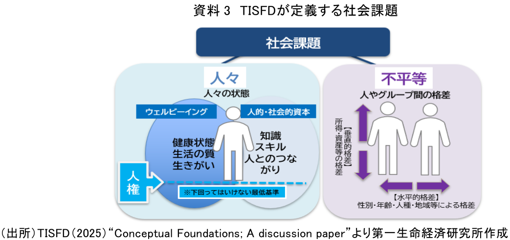 この世界観のもと、TISFDは対象となる社会課題を「人々」と「不平等」に関する問題と定義する。資料3のとおり、「人々」の状態はウェルビーイングや人的・社会的資本、そして人権という最低基準が重なり合う概念によって捉えられる。一方「不平等」は人々の間の垂直的格差(所得、資産等)と水平的格差(性別、年齢等)を指す。人権が尊重され、ウェルビーイングが高いと、人的・社会的資本は強化され、逆にこれらが損なわれると社会課題として顕在化し、企業等のリスクとなり得る。